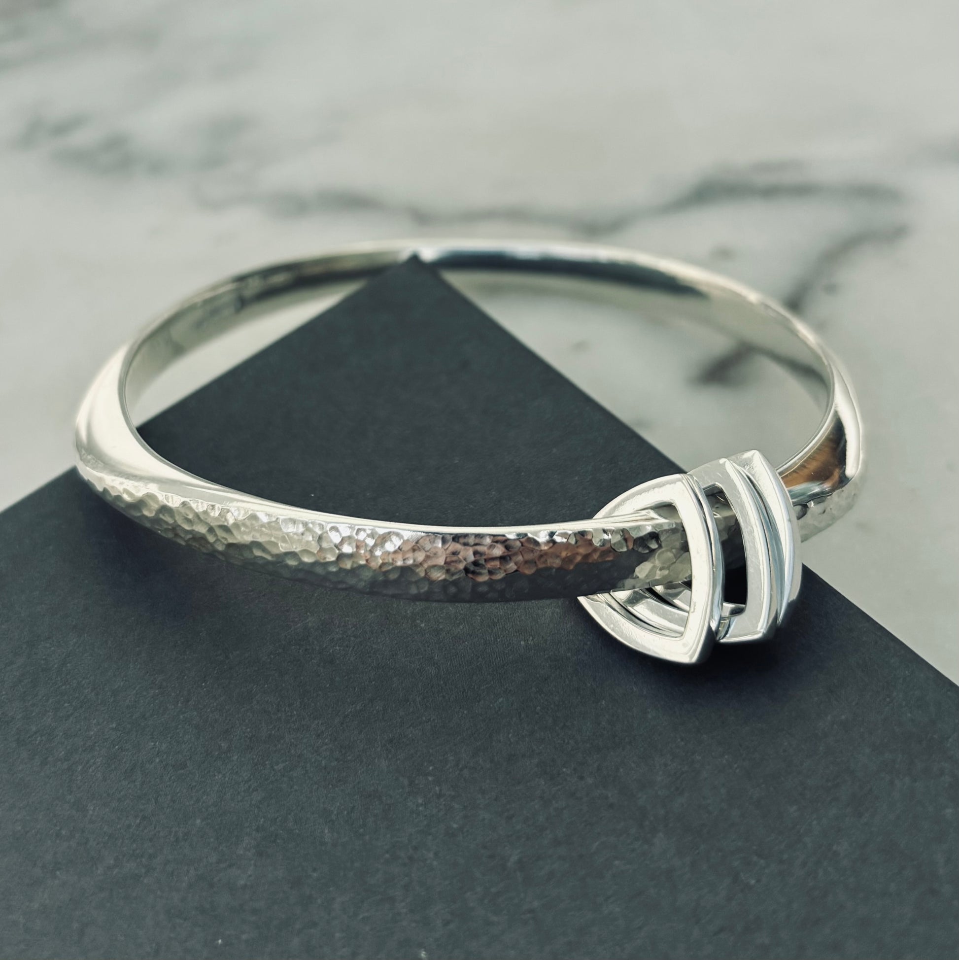Beautifully shaped sterling silver heavy weight bangle. 6mm at its widest point and available In either a light catching hand hammered or plain polished finish.